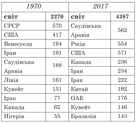 Проаналізуйте наведену в таблиці інформацію щодо обсягів видобування нафти (млн т) у світі та в десяти країнах-лідерах у 1970 р. та 2017 р. Визначте основні тенденції розвитку нафтовидобувної промисловості за цей період.