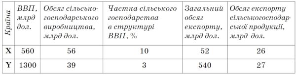 5) у країні Х сільськогосподарська продукція становить половину всього експорту, а в країні Y - тільки 5%