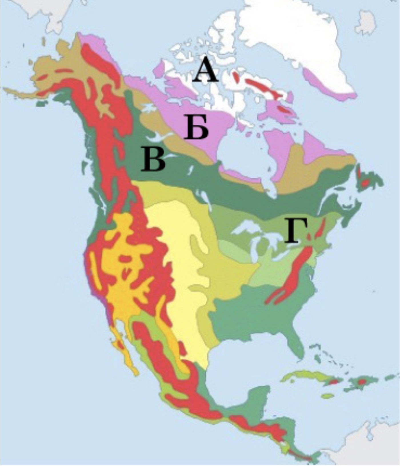 Проаналізуйте картосхему, на якій позначено природні зони Північної Америки. Укажіть природну зону, яка сформувалася в субарктичному кліматичному поясі.