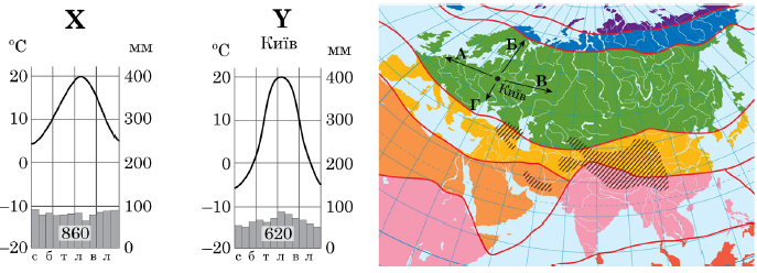 На кліматодіаграмах відображено характеристики клімату у двох пунктах спостережень – Х та Y. Пункт Y розташовано в Києві (див. карту). У якому напрямку від пункту Y розташовано пункт Х (абсолютна висота пунктів спостереження однакова)?