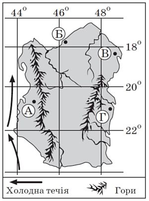 Проаналізуйте вплив основних кліматотвірних чинників (переважаючих вітрів, течій, рельєфу) на розподіл опадів на території умовного острова Х та визначте місцевість з найсухішим кліматом.