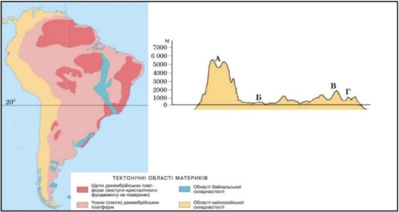 Профіль поверхні території Південної Америки побудовано вздовж паралелі 20° пд. ш. (див. карту). Місцевість з найбільшою потужністю чохла осадових порід у межах давньої платформи на профілі позначено буквою