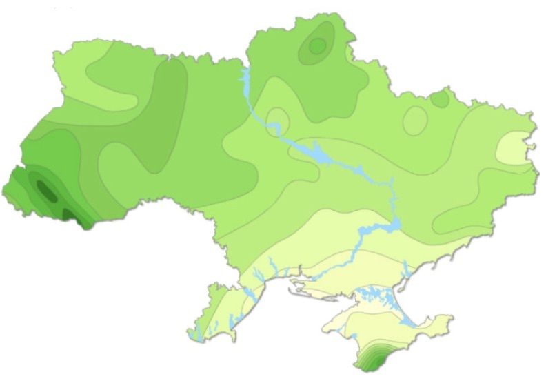 Проаналізуйте карту, на якій відображено відмінності на території України середньорічної кількості опадів (чим більша інтенсивність зеленого кольору, тим більше значення показника). Укажіть місцевість, де випадає найбільше опадів протягом року.