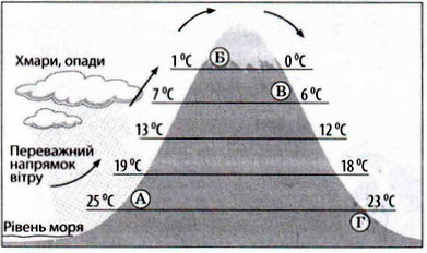 Розгляньте рисунок і визначте місце на схилах гірського хребта, де ростимуть вічнозелені вологі ліси.