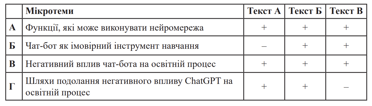 Розгляньте таблицю, у якій визначено мікротеми текстів А, Б та В. У якому рядку допущено помилку?