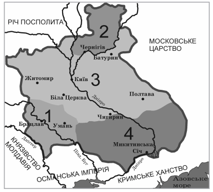 Якими цифрами на карті позначено території, втрачені Гетьманщиною за умовами Білоцерківського договору 1651 р.?