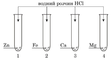 У пробірках (1-4) містяться різні метали однакової маси (див. рисунок). У кожну пробірку долили хлоридну кислоту. Усі метали прореагували повністю.