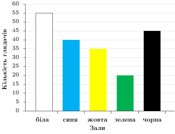 На діаграмі відображено інформацію про кількість глядачів, які протягом доби відвідали зал кінотеатру: білу, синю, жовту, зелену та чорну. За діаграмою визначте різницю між кількістю глядачів, які відвідали білу й зелену зали кінотеатру.