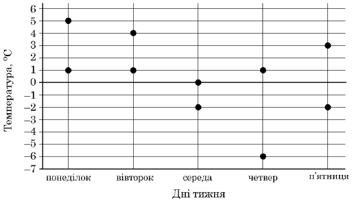 На рисунку показано точками найвищу і найнижчу температури повітря з понеділка до п’ятниці в деякому місті України. У який день різниця між найвищою та найнижчою температурами повітря була найбільшою?