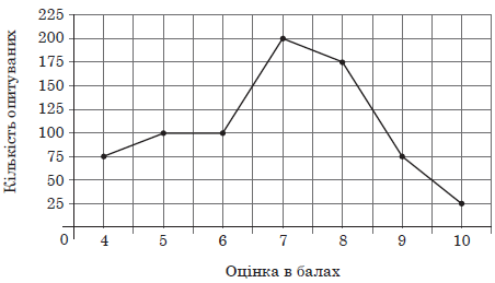 На рисунку відображено інформацію про результати опитування пасажирів транспортної мережі деякого міста щодо визначення якості пасажирських перевезень (у балах за шкалою ). Визначте кількість опитуваних, які поставили оцінку, вищу за балів.