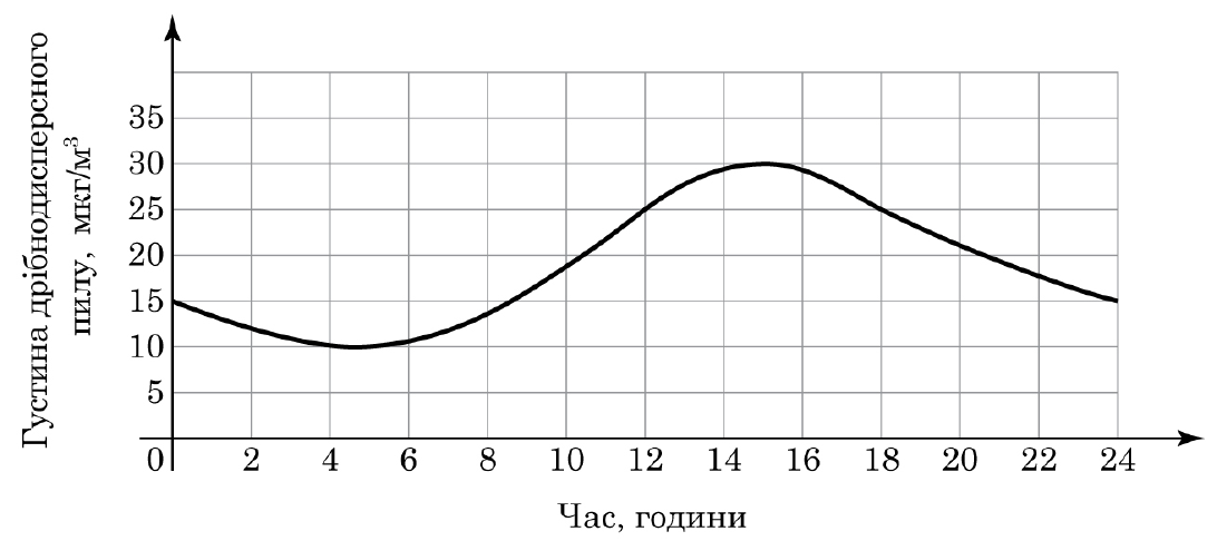 На рисунку відображено зміну густини (мкг/м3) дрібнодисперсного пилу в повітрі протягом доби в деякому районі міста. Укажіть із-поміж наведених проміжок часу (год), упродовж якого густина такого пилу в повітрі лише зменшувалася.