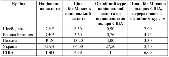 Ситуація 3 Журнал «The Economist» пропонує неофіційний спосіб визначення купівельної спроможності різних валют за допомогою «курсу Біг Мака». Щоб визначити «курс Біг Мака» національної валюти будь-якої країни, потрібно поділити ціну гамбургера «Біг Мак» від «МакДональдз» у національній валюті на ціну такого ж гамбургера в США в доларах США (USD). Якщо в країні «курс Біг Мака» вищий за офіційний обмінний курс долара США, то національна валюта переоцінена, якщо менший – недооцінена. Примітка. Ціну «Біг Мака» в національній валюті визначають за місцевими цінами на його інгредієнти (хліб, м'ясо та овочі) з урахуванням інших місцевих економічних факторів: середньої заробітної плати, вартості реклами тощо. У таблиці наведено дані, що характеризують ціни на «Біг Мак» та курси деяких національних валют за 2021 р.: