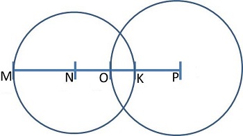 Два кола із центрами в точках N i P перетинаються (див. рисунок). Радіуси цих кіл: NК = 6 см, РО = 10 см. Обчисліть довжину відрізка ОК, якщо NP = 14 см.