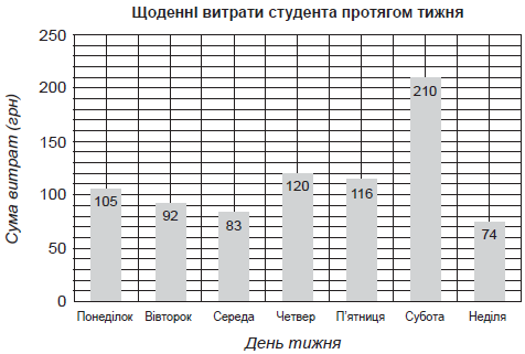 На гістограмі наведено щоденні витрати студента протягом тижня в гривнях. На основі даних цієї гістограми було побудовано кругову діаграму. Яку градусну міру має сектор «Четвер» на цій діаграмі?