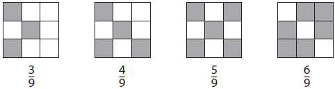 Перевір, чи правильно Тарасик зафарбував зазначену частину кожного квадрата. Порівняй дроби, використавши малюнок. Що спільного в дробах? Від чого залежить результат порівняння дробів з однаковими знаменниками?