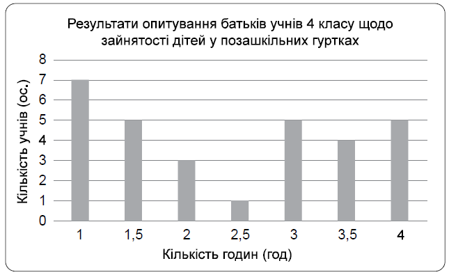 Серед батьків учнів 4 класу провели опитування, щоб з'ясувати, скільки годин на тиждень діти зайняті в позашкільних гуртках. Результати опитування наведено на діаграмі.