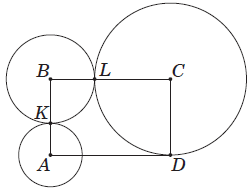 Вершини A, B i C прямокутника ABCD є центрами кіл, які дотикаються ззовні в точках K й L, вершина D належить більшому колу (див. рисунок). AD=10, AB=6.