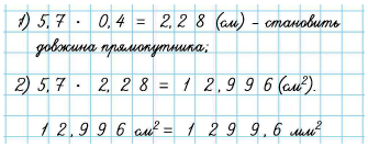Проаналізуйте фрагмент учнівської роботи з розв’язання задачі: Ширина прямокутника см5,7 см, що становить 40% його довжини. Обчисли площу прямокутника мм(мм2).